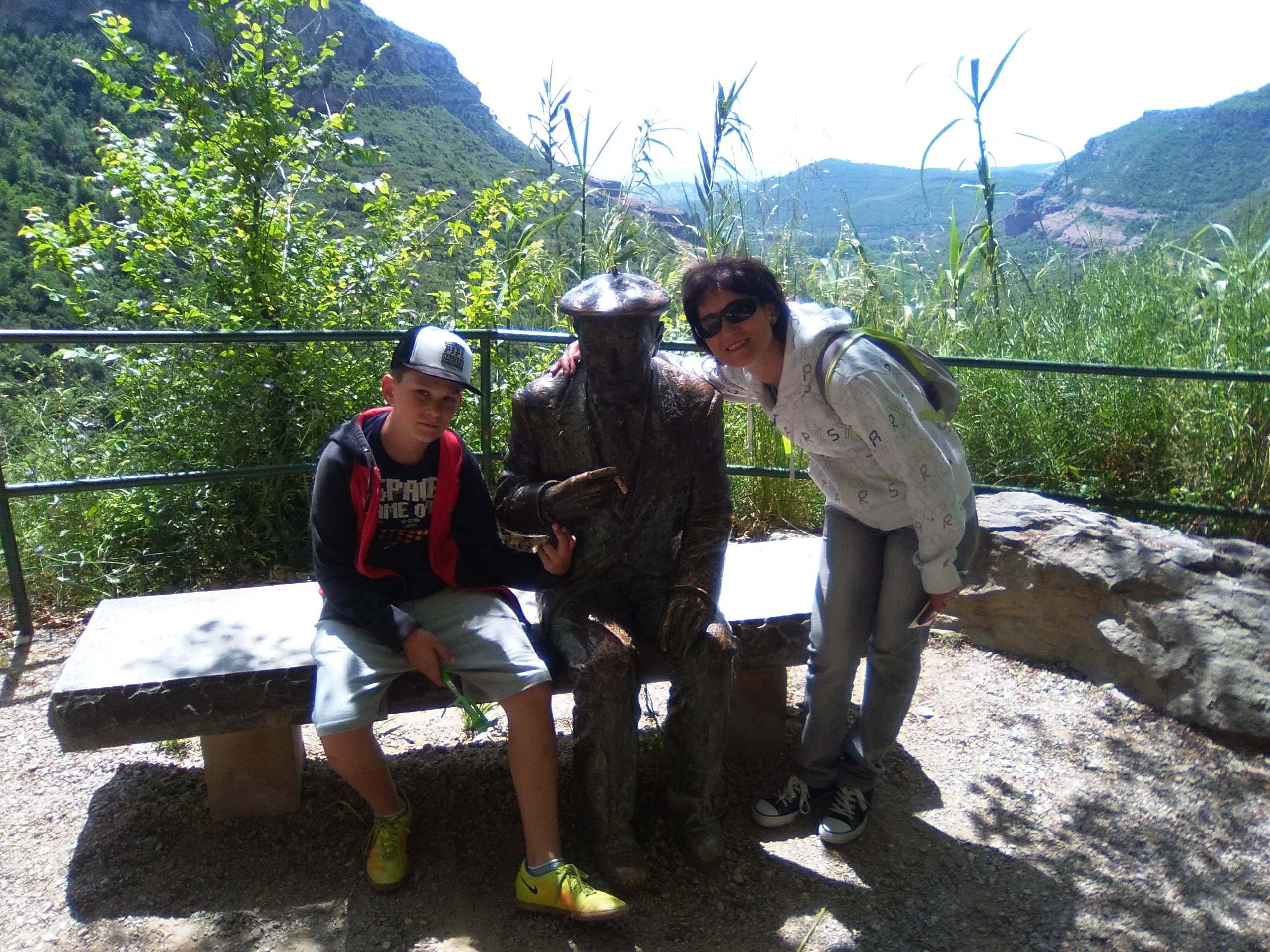 Volvemos a subir las escaleras y retomamos el camino principal, nos toparemos con una escultura sentada en un banco. Se trata de la escultura a Josep Pla, escritor y periodista catalán. Nos encontramos en la Plaça del Repòs, un espacio de silencio y paz.
